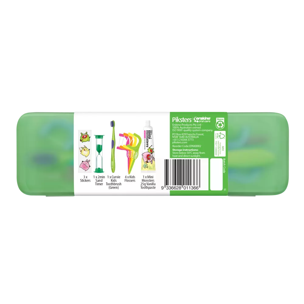 Make brushing fun with the Piksters Mini Monsters Oral Care Kit, designed to help kids develop healthy oral habits early. Featuring a 2-minute sand timer, motivational stickers, and kid-friendly essentials, this kit is packed in a durable, waterproof hard case – perfect for home or travel. Case colours are assorted and selected at random.